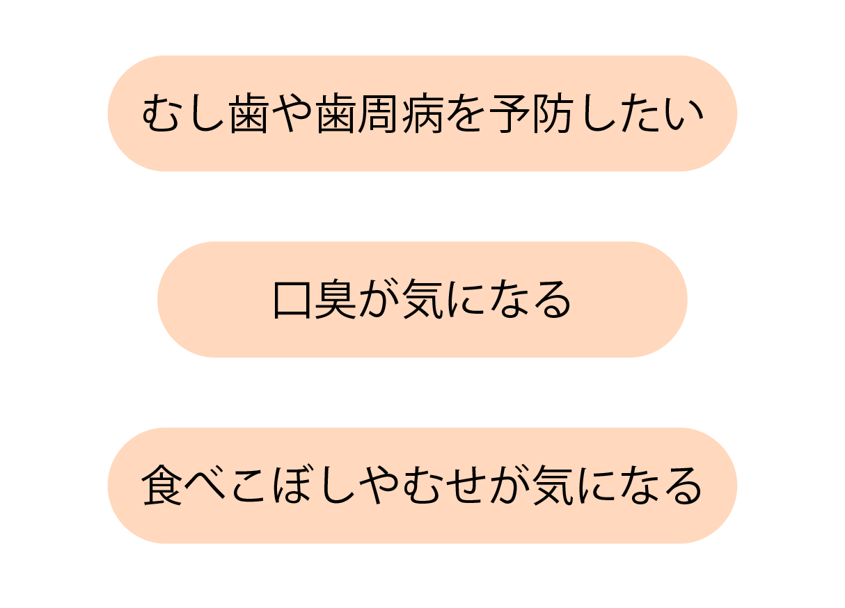 当院では、歯や歯ぐきだけでなく、「噛む・飲み込む・話す」といったお口の機能にも目を向け、一人ひとりの状態に合わせた予防ケアをご提案します。