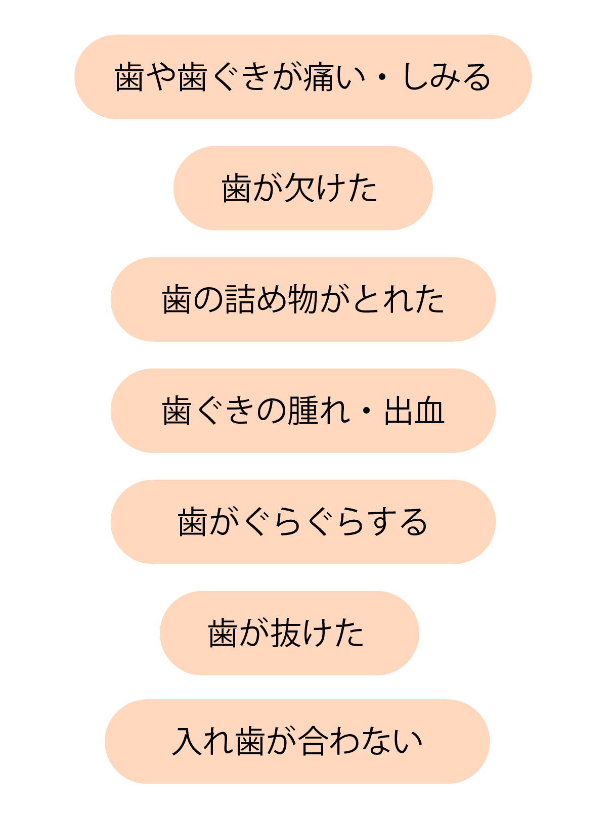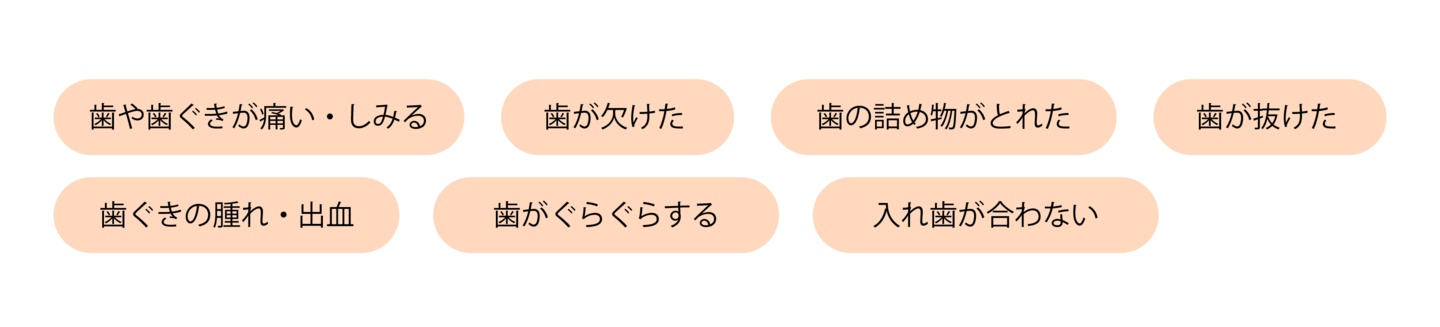 歯が痛い、歯がしみる、詰め物が取れたなどの身近なお口のトラブルから、歯ぐきの腫れや出血といった歯周病の症状まで、幅広く対応しています。早めに状態を確認し、適切に対応することで、症状の進行を防ぐことができます。