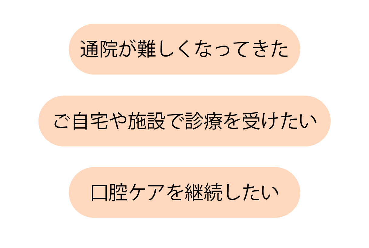 お一人での通院が難しい方や、外出が困難な方のために、歯科医師・歯科衛生士がご自宅や施設へ訪問して診療を行います。虫歯や歯周病の治療、入れ歯の調整・作製、口腔ケアなど、歯科医院と同等の診療が可能です。お口の状態を整えることで、「口から食べる」「会話を楽しむ」といった日常生活の質の維持にもつながります。